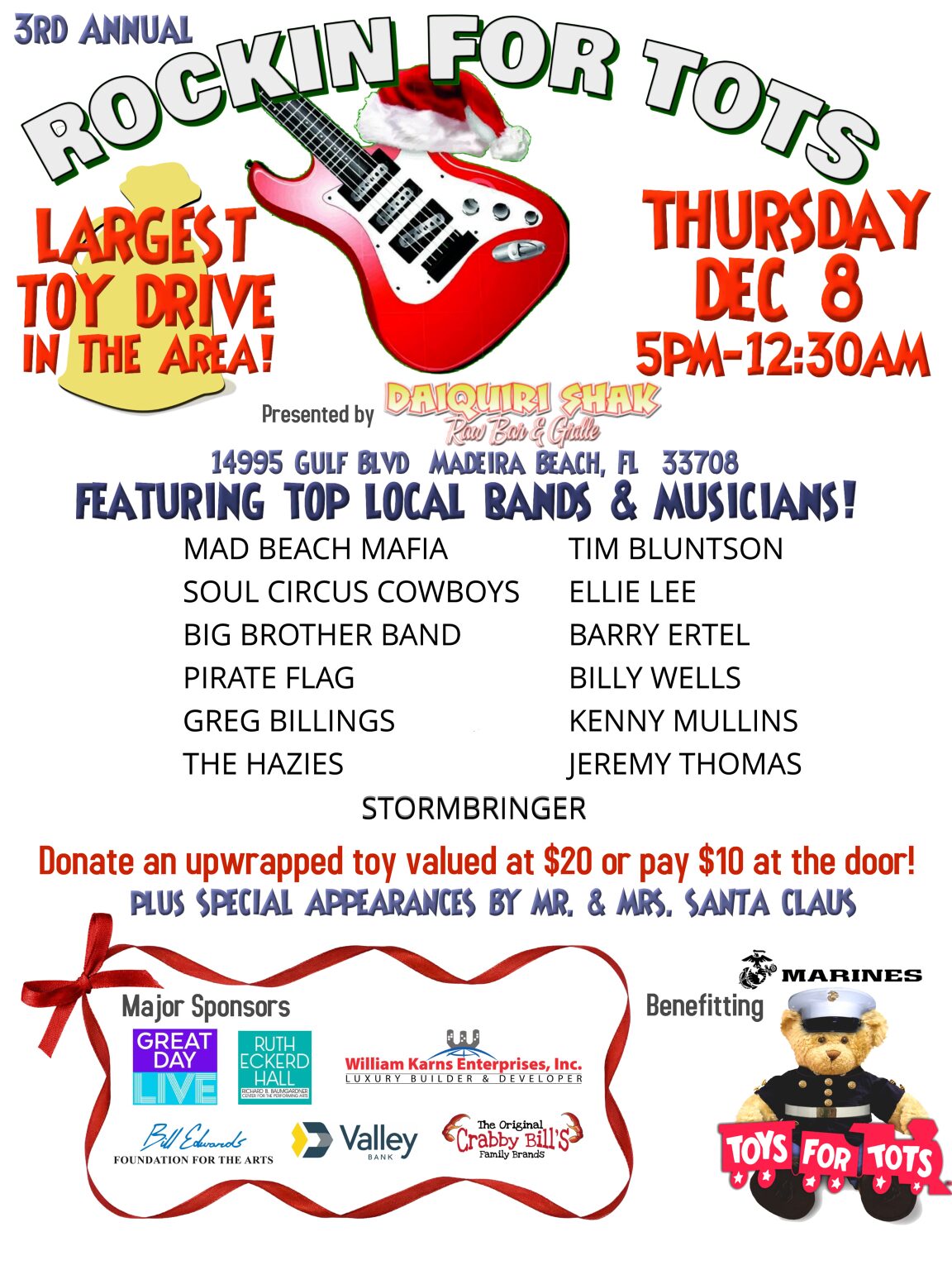 « All Events This event has passed. 3rd ANNUAL TOYS FOR TOTS ROCKIN FOR TOTS SHOW! December 8, 2022 @ 5:00 pm « PRETTY KOOL LIVE! DOUG SOUTH BAND LIVE! » Help raise money and toys for the kids at our annual official TOYS FOR TOTS toy drive event! All the areas best live entertainment! + Google Calendar+ iCal Export Details Date: December 8, 2022 Time: 5:00 pm Event Category: Live Music Venue Daiquiri Shak Raw Bar & Grille 14995 Gulf Blvd. Madeira Beach, FL 33708 United States + Google Map Phone: 727-393-2706 Related Events KEVIN TOON December 19 @ 3:00 pm - 7:00 pm|Recurring Event (See all)An event every week that begins at 3:00 pm on Friday, repeating until March 13, 2026 SALTCRUSH BAND LIVE! December 19 @ 8:00 pm STORMBRINGER LIVE! December 20 @ 8:00 pm