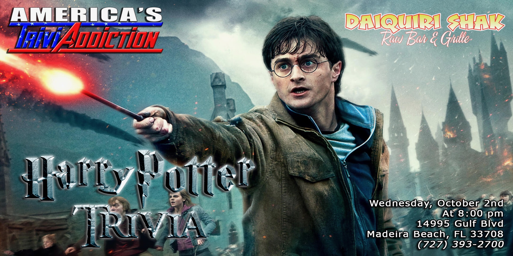 « All Events This event has passed. HARRY POTTER TRIVIA TOURN. October 2, 2019 @ 8:00 pm - 11:00 pm « BIG BROTHER THE GREG BILLINGS BAND » Come win cool stuff at our Harry Potter Themed Trivia Tourn! + Google Calendar+ iCal Export Details Date: October 2, 2019 Time: 8:00 pm - 11:00 pm Event Category: Fun & Games
