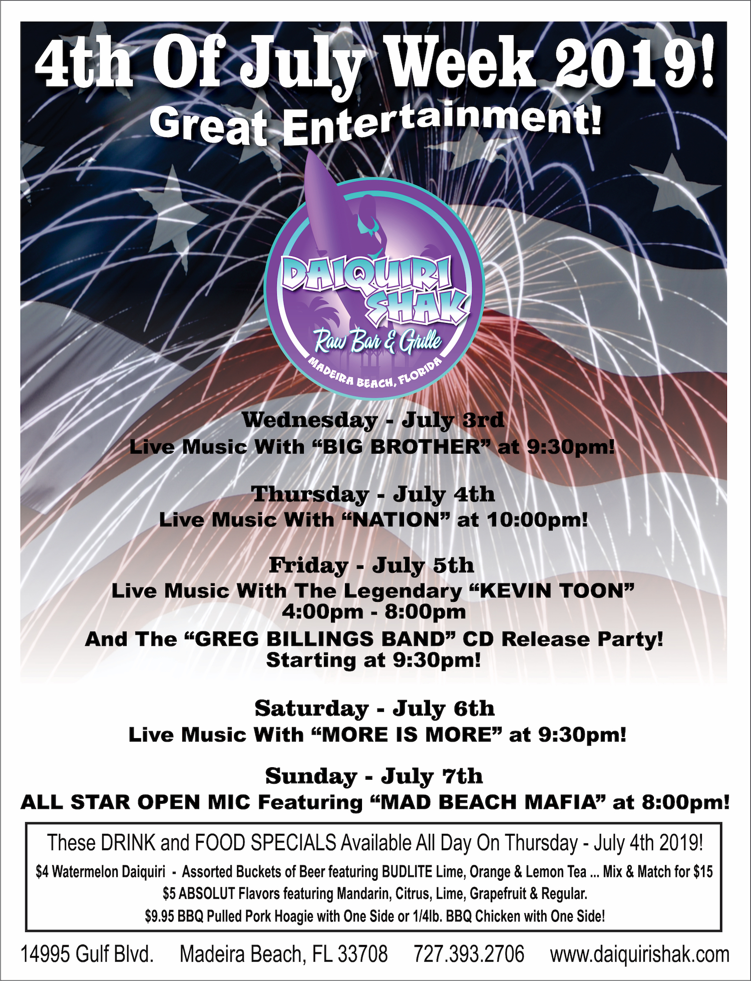 « All Events This event has passed. JULY 4th WEEKLONG CELEBRATION! July 2, 2019 - July 8, 2019 « SOUL CIRCUS COWBOYS BIG BROTHER » + Google Calendar+ iCal Export Details Start: July 2, 2019 End: July 8, 2019 Event Categories: Fun & Games, Live Music, Specials Related Events KEVIN TOON January 16 @ 3:00 pm - 7:00 pm|Recurring Event (See all)An event every week that begins at 3:00 pm on Friday, repeating until March 13, 2026 STORMBRINGER LIVE! January 16 @ 8:00 pm STEALING CROWNS LIVE! January 17 @ 8:00 pm