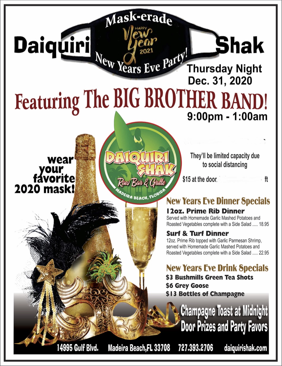 « All Events This event has passed. NEW YEARS EVE BASH HOSTED BY BIG BROTHER! December 31, 2020 @ 7:00 pm - January 1, 2021 @ 7:00 pm « JEFF GURNEY LIVE! BILLINGS/WAGNER live Acoustic! » The Daiquiri Shak Annual New Years Eve Bash! Hosted by BIG BROTHER…party favors, champagne toast and more! + Google Calendar+ iCal Export Details Start: December 31, 2020 @ 7:00 pm End: January 1, 2021 @ 7:00 pm Event Category: Live Music Venue Daiquiri Shak Raw Bar & Grille 14995 Gulf Blvd. Madeira Beach, FL 33708 United States + Google Map Phone: 727-393-2706 Related Events FULL FLEDGED UNIT LIVE! October 10 @ 8:00 pm STORMBRINGER LIVE! October 11 @ 8:00 pm ALL STAR OPEN MIC hosted by THE MAD BEACH MAFIA! October 12 @ 8:00 pm - 11:00 pm|Recurring Event (See all)An event every week that begins at 8:00 pm on Sunday, repeating until May 31, 2026