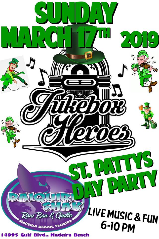 « All Events This event has passed. ST. PATRICKS DAY BASH hosted by JUKEBOX HERO March 17, 2019 @ 6:00 pm « RETRIBUTION AUDIOSTAR » ST. PATRICKS DAY BASH hosted by JUKEBOX HERO 6pm + Google Calendar+ iCal Export Details Date: March 17, 2019 Time: 6:00 pm Event Category: Live Music Related Events KEVIN TOON March 13 @ 3:00 pm - 7:00 pm|Recurring Event (See all)An event every week that begins at 3:00 pm on Friday, repeating until March 13, 2026 THE HURRICANE SHANE BAND LIVE! March 13 @ 8:00 pm FULL THROTTLE LIVE! March 14 @ 8:00 pm