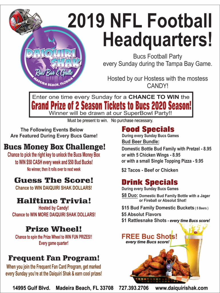 All events for SUNDAY NFL PARTY – ALL NFL GAMES! WIN BUCS SEASON TICKETS! « All Events « Previous Events September 2019 SUNDAY NFL PARTY – ALL NFL GAMES! WIN BUCS SEASON TICKETS! September 8, 2019 @ 11:00 am - 8:00 pm|Recurring Event (See all)An event every week that begins at 11:00 am on Sunday, repeating until January 12, 2020 Find out more »