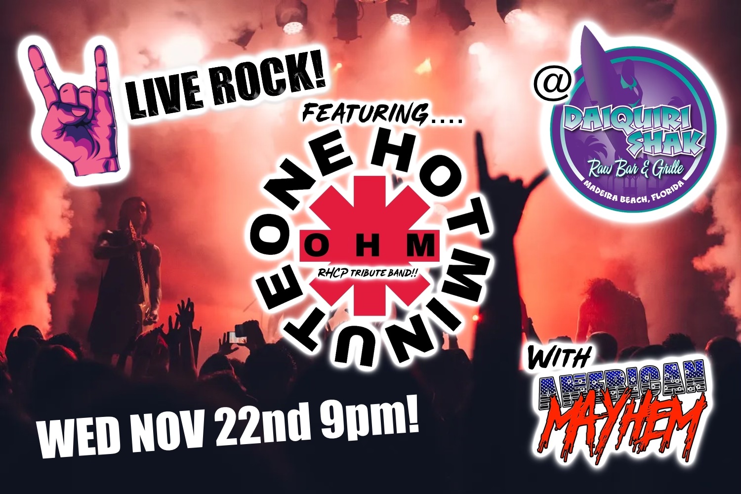 « All Events This event has passed. THANKSGIVING EVE BASH featuring the Ultimate RED HOT CHILI PEPPERS TRIBUTE – ONE HOT MINUTE! November 22, 2023 @ 9:00 pm « 1/2 PRICE APPS! 4pm-6pm! Monday – Thursday LIVE WITHOUT A NET! – VAN HALEN TRIBUTE » RED HOT CHILI PEPPERS TRIBUTE BAND with special guests AMERICAN MAYHEM! + Google Calendar+ iCal Export Details Date: November 22, 2023 Time: 9:00 pm Event Category: Live Music Related Events SALT CRUSH BAND LIVE! November 7 @ 8:00 pm RED SUNDAY LIVE! November 8 @ 8:00 pm ALL STAR OPEN MIC hosted by THE MAD BEACH MAFIA! November 9 @ 8:00 pm - 11:00 pm|Recurring Event (See all)An event every week that begins at 8:00 pm on Sunday, repeating until May 31, 2026