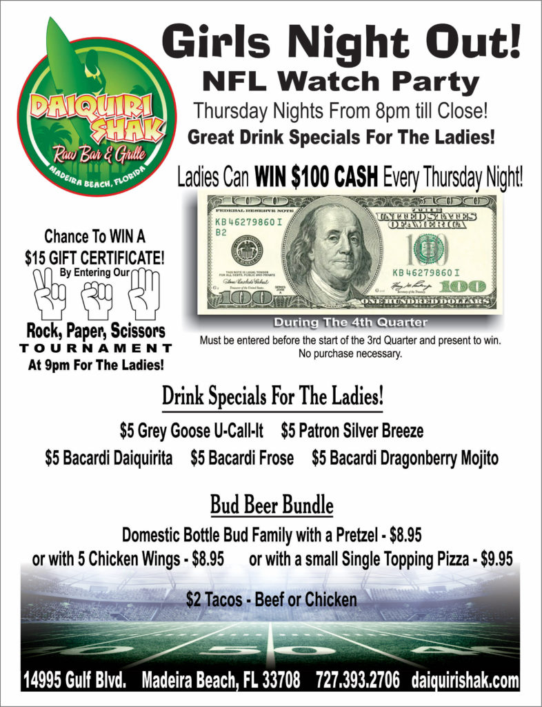 All events for THURSDAY NIGHT NFL FOOTBALL GIRLS NIGHT OUT « All Events « Previous Events September 2019 THURSDAY NIGHT NFL FOOTBALL GIRLS NIGHT OUT September 5, 2019 @ 8:00 pm|Recurring Event (See all)An event every week that begins at 8:00 pm on Thursday, repeating until January 30, 2020 One lucky lady will win $100.00 CASH every Thursday night! Great drink and food specials! Find out more »